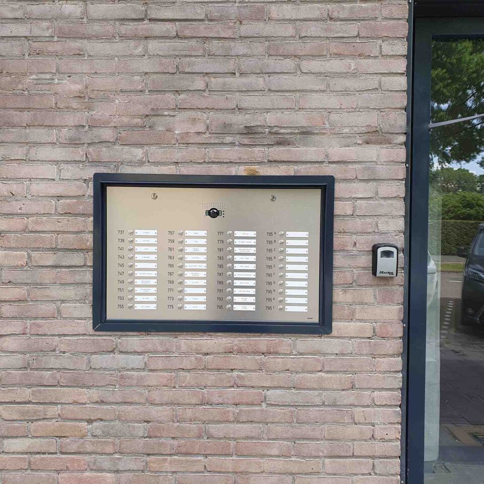 Bij de entree hebben we een volledig nieuw belpaneel geplaatst, voorzien van 40 drukknoppen. Hiermee kunnen zowel de 30 bestaande als de 10 nieuwe appartementen individueel worden opgeroepen. Het paneel is uitgerust met een geïntegreerde camera, waardoor bewoners bezoekers kunnen zien en spreken via het video-intercomsysteem.