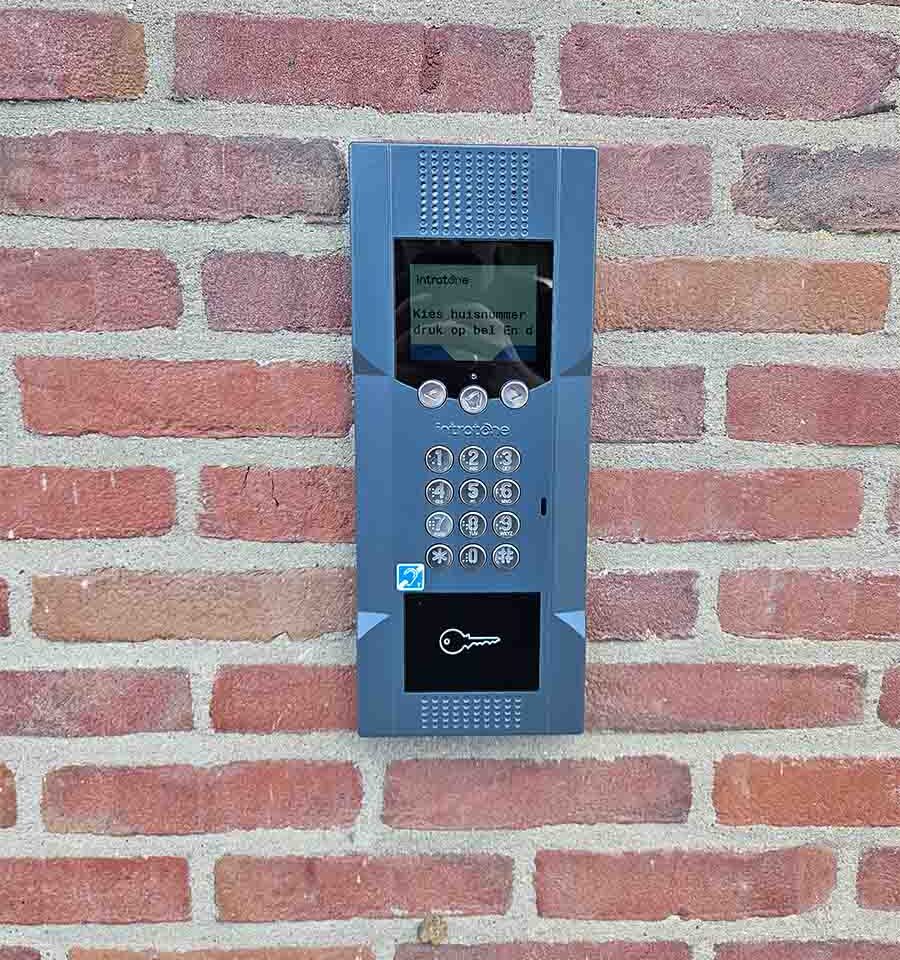 Voor deze locatie is gekozen voor een Intratone video-intercomsysteem met camera. Het systeem werkt via het mobiele netwerk en maakt het mogelijk om oproepen rechtstreeks op een telefoon te ontvangen.